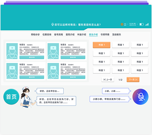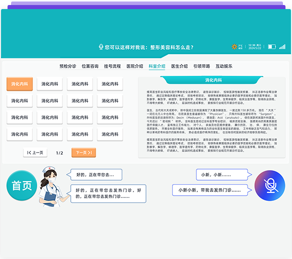 智能語(yǔ)音識(shí)別(關(guān)鍵字,語(yǔ)義雙重識(shí)別方式),導(dǎo)醫(yī)系統(tǒng)已經(jīng)覆蓋了40個(gè)科室中的6000多種常見(jiàn)病,并且搭載了智能自診、智能導(dǎo)診、智能預(yù)問(wèn)診、智能問(wèn)答等板塊功能,可以自主回問(wèn)題;用戶(hù)可以自行添加、修改知識(shí)庫(kù)?。語(yǔ)音對(duì)話(huà)和控制:人與機(jī)器人交流,不單純靠固定語(yǔ)句,可以智能回答問(wèn)題——人與機(jī)器人可以隨意交流;也可語(yǔ)音控制機(jī)器人到達(dá)指定位置,例:我感冒了掛什么科?機(jī)器人通過(guò)專(zhuān)業(yè)醫(yī)療知識(shí)及大數(shù)據(jù)分析告知你準(zhǔn)確的科室。